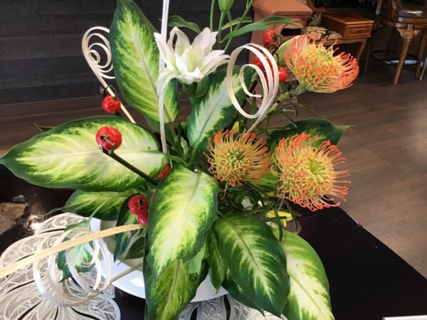 ロビーを彩る今回のお花は、目を引く存在感がありながら、どこか穏やかで優しい印象を与えてくれています。