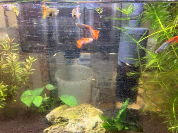 グッピーは知らない間に子供が生まれて数が増え、エビと共に水槽の中をのびのびと泳いでいます。