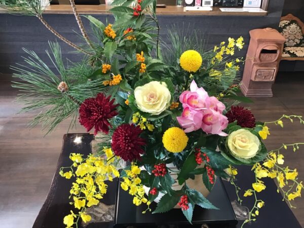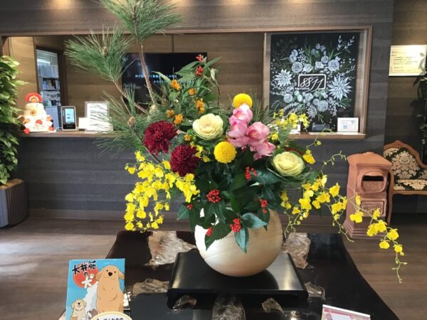 ロビーには、新しい年の始まりにふさわしい、晴れやかであたたかみのあるお正月のお花を飾っていただきました。