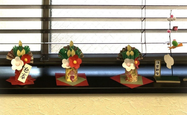 ご利用者がいて卓上の装飾品制作していました。記念に1枚…ミニ門松達です!