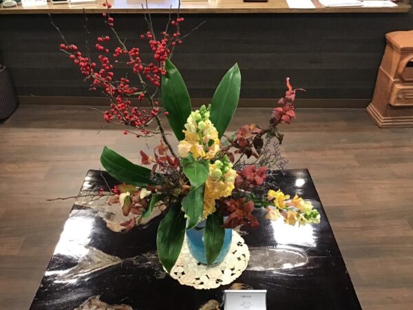 今週ロビーに飾っていただいたお花は、秋の深まりをそっと映し出すような落ち着いた彩りのアレジメントです。