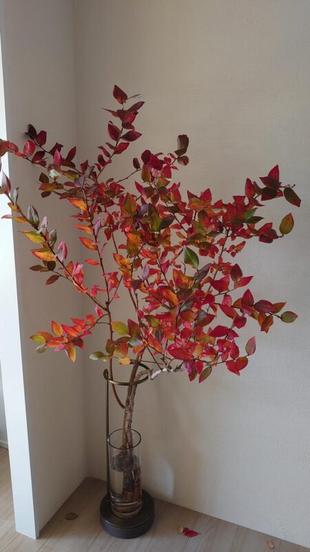 周りを彩る、深い赤色の紅葉ペリカムの葉はまるで季節の風景をそのまま切り取ったようで、ひとつの花器の中に秋が集まっている感じです。